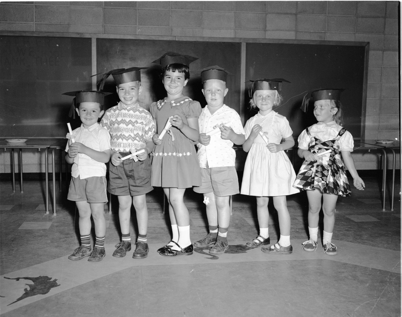You don’t have to go to Queen’s, Yale or Oxford to have a formal graduation, say these youngsters, who will be moving up to Grade 1 from kindergarten next year. Wearing black crepe paper “mortarboards” are, left to right, Dennis Salichuk, Kirk Rutherford, Debbie Mount, Doug Howell, Lynne Harmsworth and Debbie Edwards. They attended classes at Regent School under kindergarten teachers Miss Margaret Marks and Mrs. Ken Cowan (Dorothy) this past term.