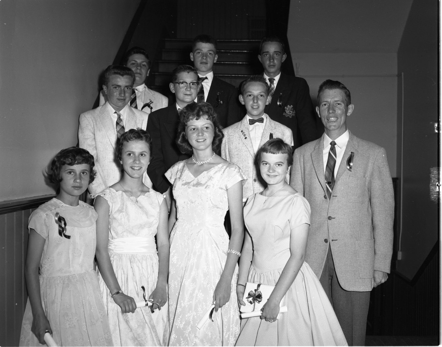 No trouble getting these Grade 8-B students to smile as they received their graduation diplomas at Parkview Public School, Midland, Thursday night. Seen with them is teacher, Jack Yelland, the pupils are left to right front row – Janice Bowen, Mary Lynn Boyd, Gayle Ellison, Beth Boyd; centre row – John Burke, Gerhard Bezner, Jim Cleaver; back row – Peter Ellery, Dalton Crawford, John Delaney.