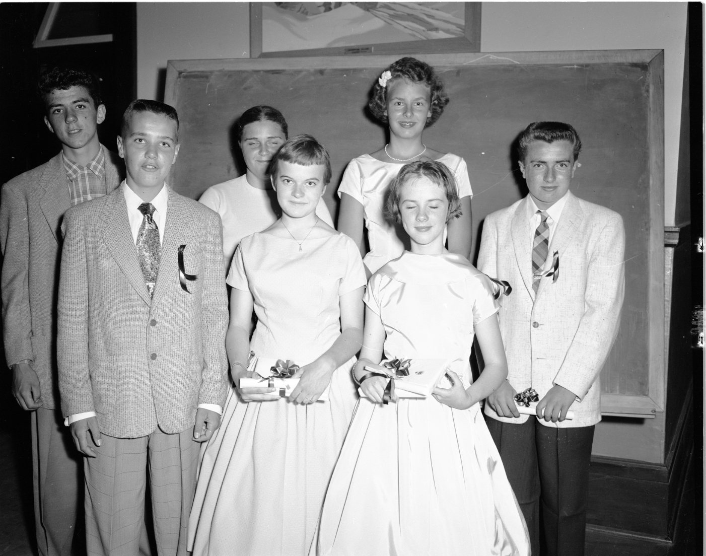 Graduation night for Grade 8 pupils of Midland’s Sixth street Public Schools brought special honours to these pupils. Left to right, they are Charles Scott (Sixth St.), Rickey Mohan, Fay Robins, Beth Boyd, Susan Swan, Betty Morrison and John Burke. Susan and John Burke were named senior girl and senior boy at Parkview, with Fay Robins and Charles Scott taking similar honours at Sixth Street.