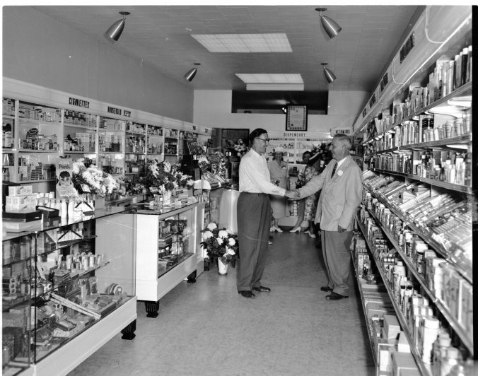 Official opening of Reg Mulligan’s new drug store on King Street, opposite the United Church, was held Friday. Another King Street merchant and old friend, Lorne Watson (left) extends best wishes to Mr. Mulligan while ladies serve coffee and cake in the background.