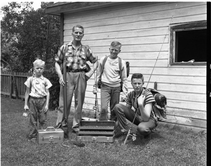 Great adventure in the Gogama woods lies ahead for these three Midland lads, seen with their father, Pete Pettersen. Boys are (left to right) Bruce, 6, Jon, 12, and Bjorn,15. The boys’ activities will be filmed by two cameramen under the sponsorship of sporting goods and boat firms. All phases such as camping and fishing will he filmed during the one to three-week stay in the northland.
