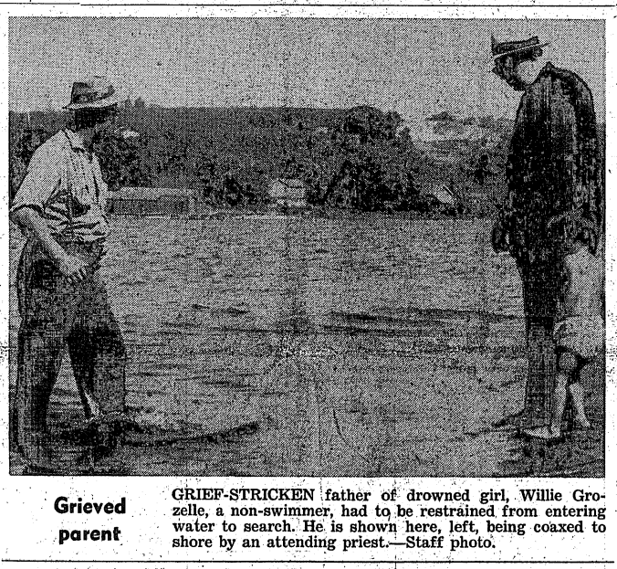 - County Herald headline of July 10, 1959; Nine-Year-Old Girl Drowns, Sister and Pal See Tragedy. Penetang Bay claimed its first drowning victim of the year Wednesday afternoon when 9-year-old Evelyn Grozelle drowned. Currents are believed to have swept her into deep water while she was swimming. The same current came close to claiming the lives of her two companions, her sister Lucille, 14, and Jeannette Boucher, 15. The dead girl is the daughter of Mr. and Mrs. Willie Grozelle of Highland Point on the west shore of Penetang Bay. The three girls apparently went swimming at a beautiful little sand spit known locally as Piitz Point. The sandy bottom at this point drops off sharply about 75 feet from shore.