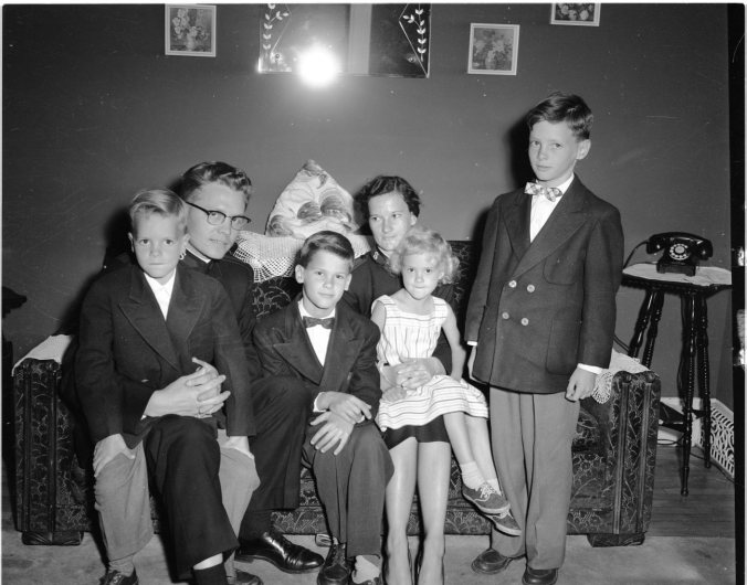 Midland’s new Salvation Army leaders, Lieut. William and Mrs. Johnston have arrived at the local Citadel, succeeding Lieut, and Mrs. George Swaddling posted to Halifax. Children are, left to right, Bobby, 8, Leonard 11, Dianne, 5, and Paul, 10. Mrs. Johnston is also a lieutenant in the corps, husband and wife having attended training college together in Toronto. Midland is their first charge.