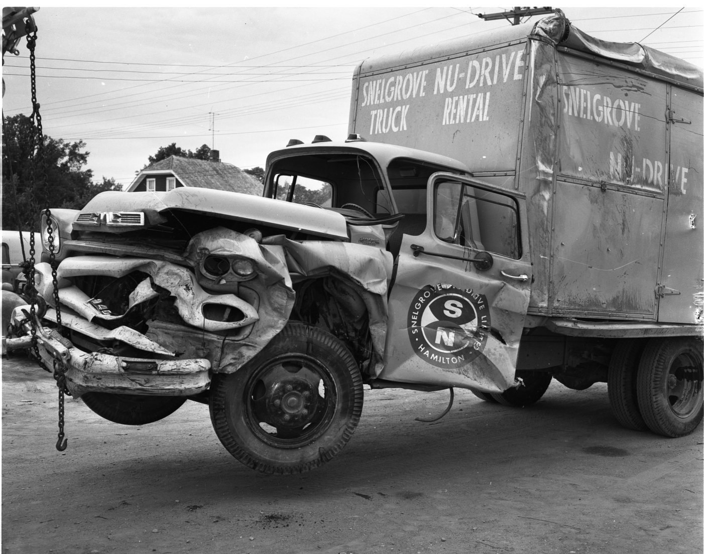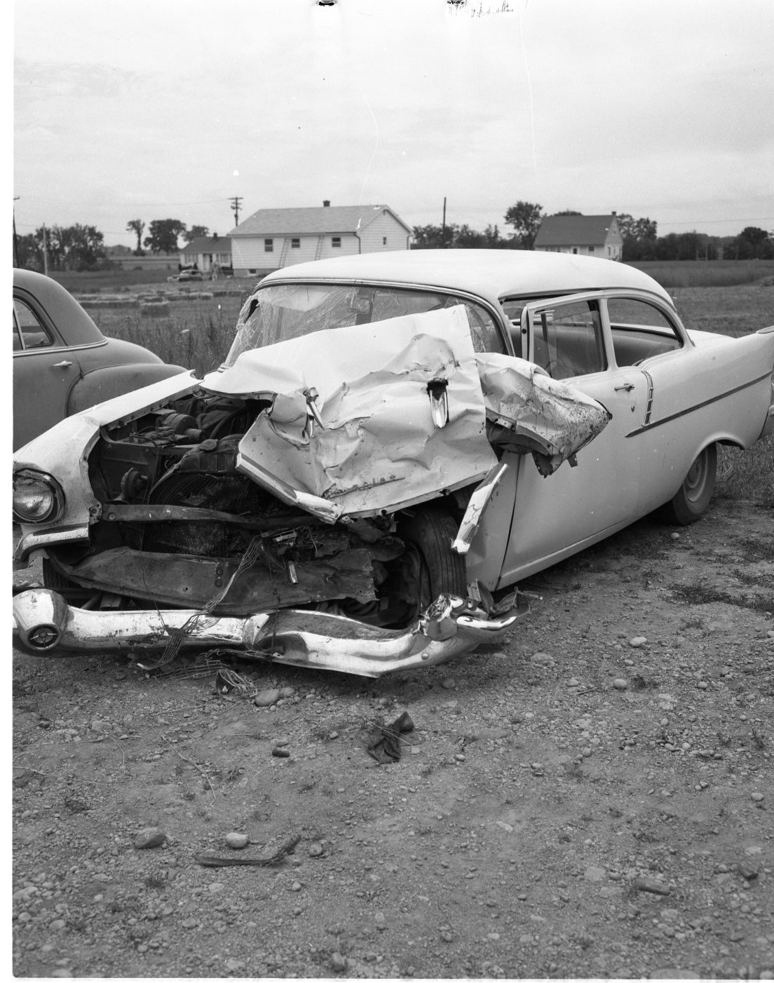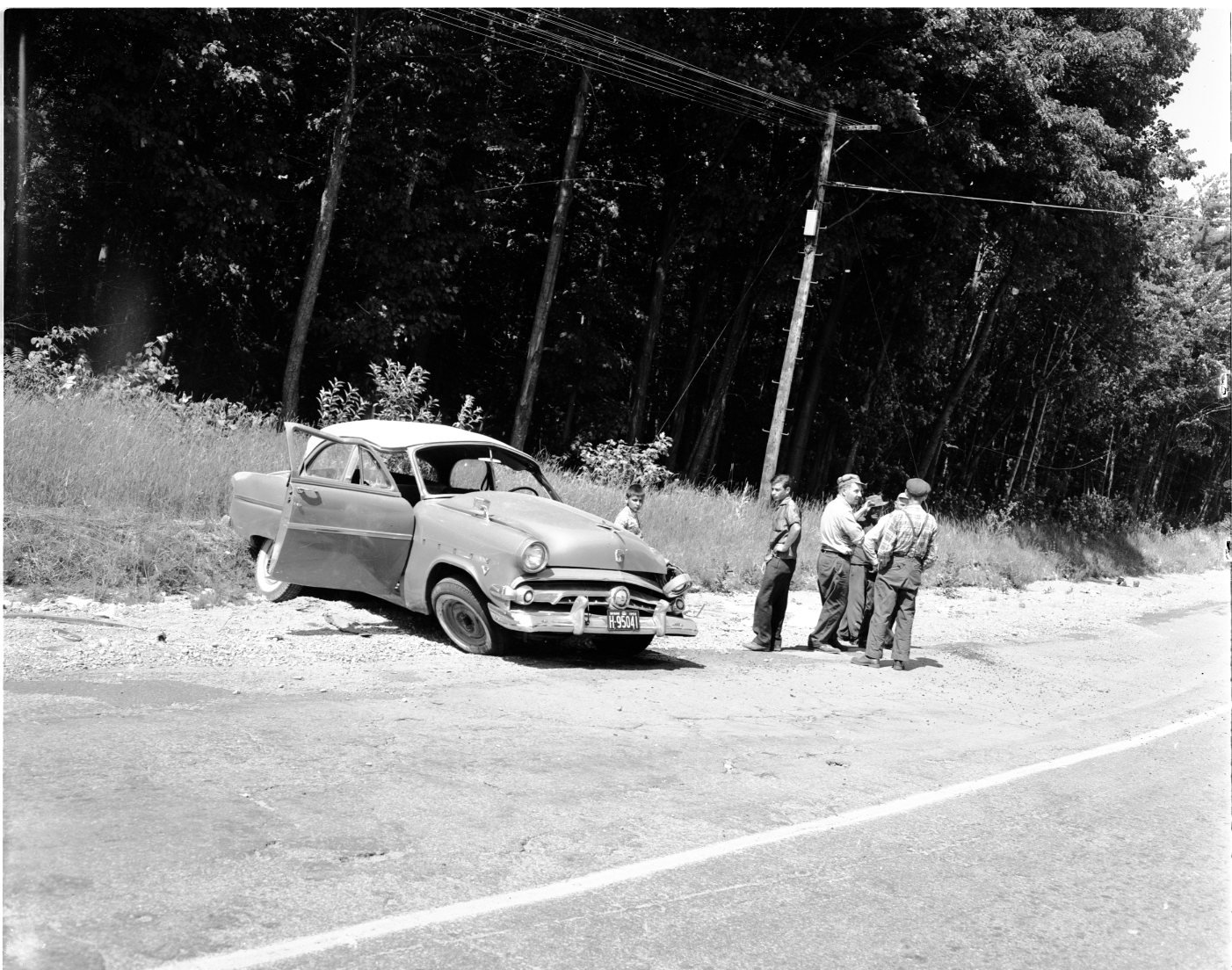 This 1954 model car was written off as a total wreck after it had flipped over on County Road 2, July 4. The driver, still dazed, stands between the boy examining the damage amid the group of spectators at right. The driver told police he was forced off the road by an approaching vehicle.