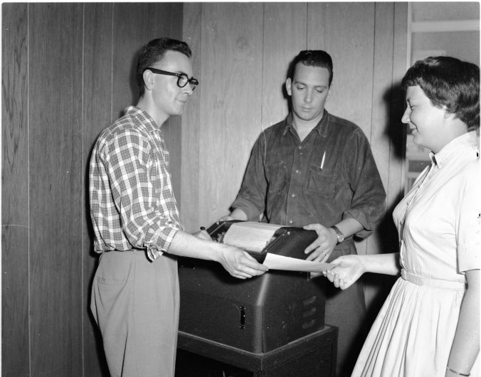 Gathered around the teletype above are news editor John McCullough (left), program director Grant Forsythe and Madeline Vallee of Penetang, secretary.