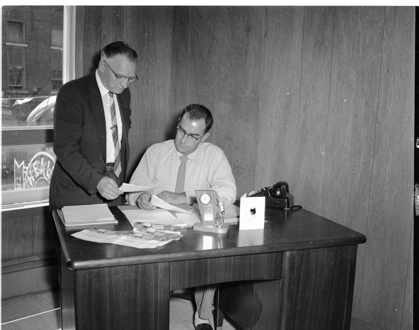 Roy Goran adjusts the controls while Bob Vanstone, former Midlander serving as commercial manager, makes an announcement from the glass-fronted studio.