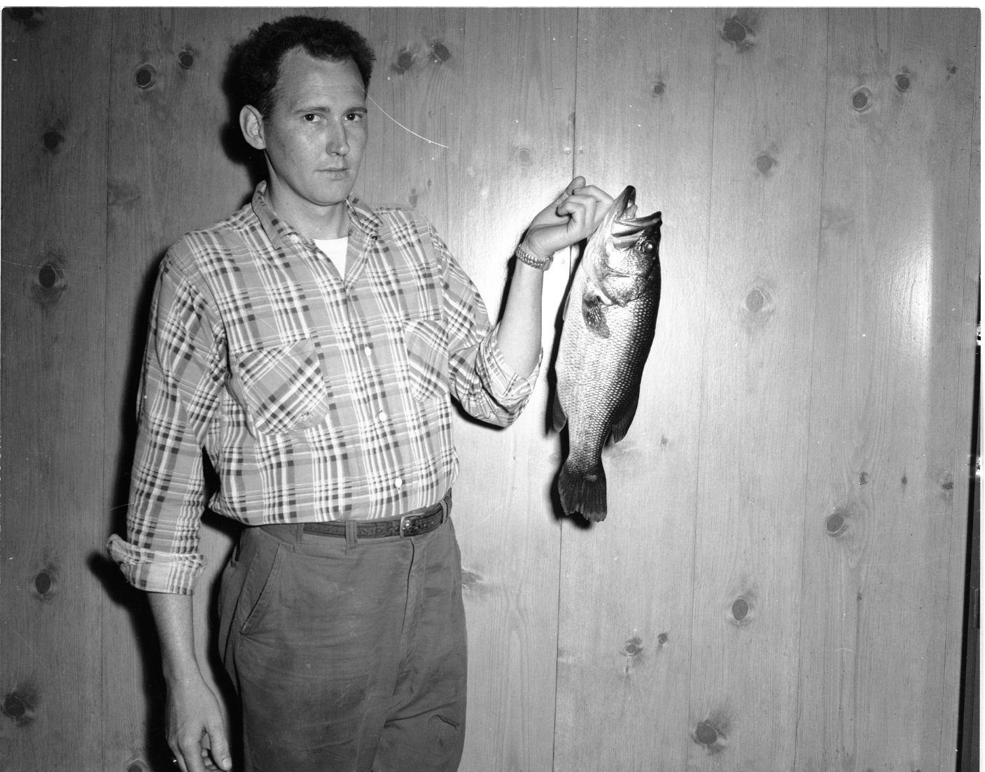 First big fish of the bass season at Midland’s Little Lake reported to this office is this 5 lb., 3 oz. beauty. It was caught by Daryl Carson of Oakville using a Paul Bunyan 66 as the lure. Caught during last Wednesday night’s heavy rainstorm, the “big mouth” was 20 inches long. “We were trying out a brand new boat dad made. It got a good christening; with the rain and this fish” said Mr. Carson.