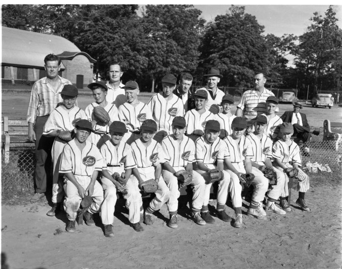 Midland will be represented in the Ontario Baseball Association’s pee-wee playdowns this year by the team seen here. Sponsored by the Lions Club, the boys are left to right, front row – Keith Bath, Ken Edgar, Chester Graham, Keith Craig, Wayne Holden, Fred Hacker, Alan Mostyn, Earl Scott; back row – Murray Oliver, Morley Bath, David Brooks, John Quinn, Art McComb, Bob Clayton, John Webb. In charge of the boys are Frank Graham, Frank Webb, Tom Scott, Bill Brooks and Murray McComb.