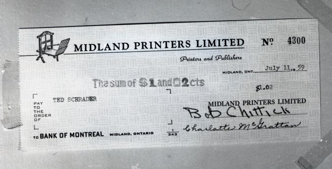 Just to keep the record straight and to prove to writer Ted Schrader that there is “money” in writing, the Free Press Herald photographed the cheque that is being mailed to him for his first article, which appeared on last week’s editorial page. In his feature Dateline: Port Severn, which appears on today’s editorial page, writer Schrader claims he lost money on the deal, contending that he received $1 for the piece while his out-of-pocket expenses amounted to $1.01.