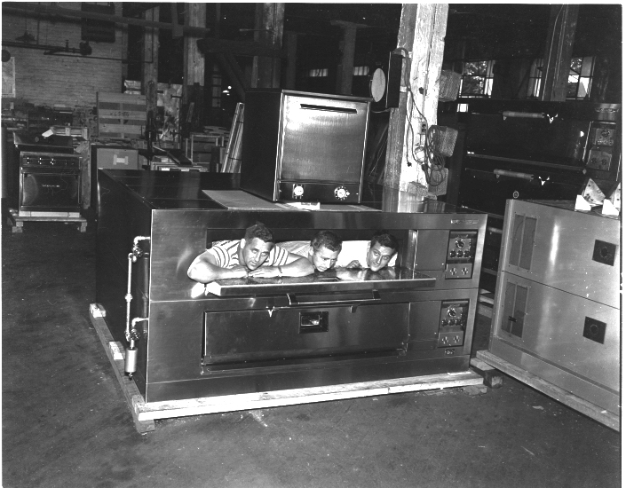 Largest commercial oven ever built at the James Stewart Manufacturing / Beatty plant in Penetang is shown here with three men comfortably accommodated in the upper deck. Oven sitting on top is a standard domestic built-in type for kitchens. Built for the Iron Ore Co. Ltd. for use in their mining camps in Labrador, 98 nine-inch pies or 144 loaves of bread can be baked at one time and the unit weighs 4,000 pounds. A considerable number of commercial installations have been made by the Stewart Manufacturing plant in Penetang. A list reads much like a directory of a majority of the new large buildings erected in Ontario and Quebec during the past several years. One of the large orders being produced at the present time is equipment for new sanitarium buildings in Hamilton. Many of the newer hotels throughout the two provinces, are also using Beatty commercial equipment.