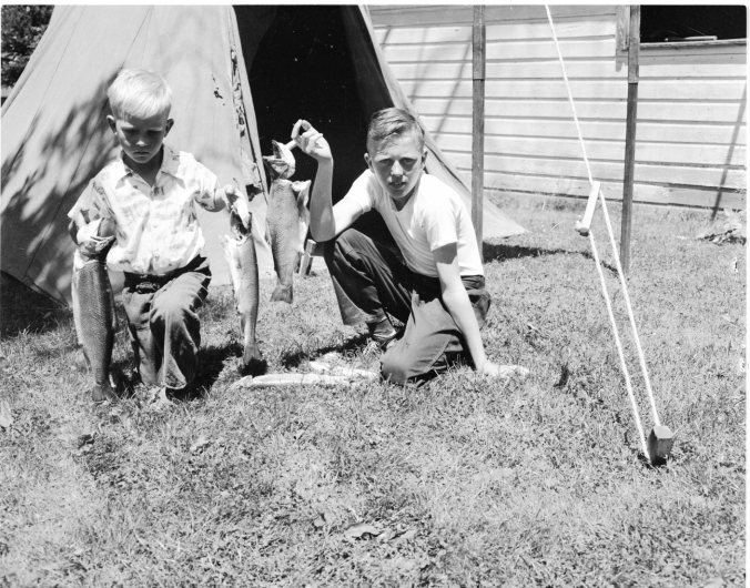 Big enough to make many a veteran fisherman’s mouth water, these four-pound speckled trout were caught by Bruce, 6, and Jon Pettersen, 12, in the Gogama district of Northern Ontario. Along with brother Bjorn, 15, the three boys provided the human interest in a week-long outdoor life movie being made in the north country for a number of sporting goods firms. “Too much movie and not enough time for fishin’,” was the somewhat disgruntled verdict of the boys upon their return to Midland with dad, Pete Pettersen.