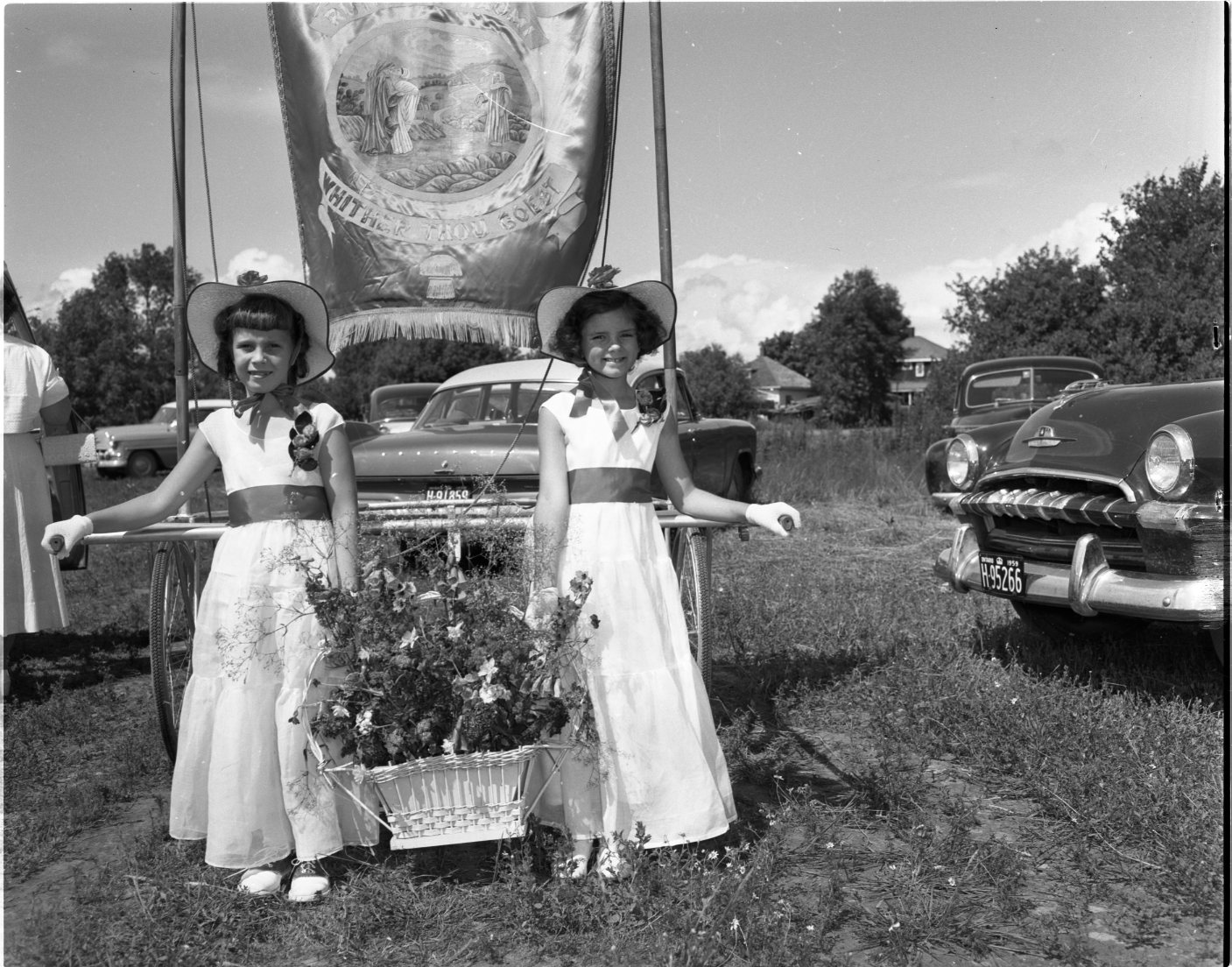 Sweethearts of the big Orange parade in Elmvale Saturday were Joanne Blow, left, and Joan Caston. Carrying their big flower basket, the two little girls marched with the Wyevale Lodges in the mile-long parade.