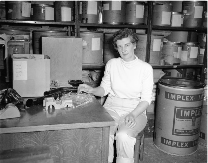 With 13 years in the plastics industry behind her, Mrs. Martha Hewlett is well qualified for her position at Midland Plastics Ltd. Familiar with every type of this material, Mrs. Hewlett is head of the grinding department, where she oversees the grinding of scrap material and its return to the proper bins. Making it a real family affair, her daughter, Mrs. Charles Dimmock (Shirley) is employed in the head office, Toronto. Mr. Dimmock was also employed in the same firm before resigning to become a Toronto policeman. Mrs. Hewlett is seen above with some articles returned for re-processing.