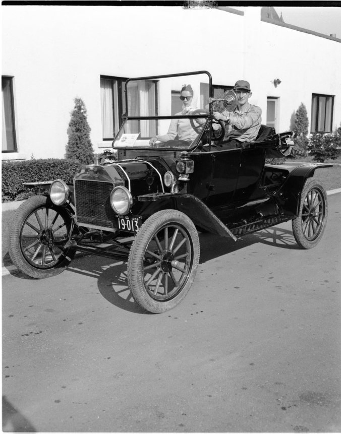 When you and I were young, Maggie, this 1913 Ford roadster owned by Mr. and Mrs. D. Belfry, London, was pretty hot stuff. Kept spic and span, it was one of some 40 cars of the Horseless Carriage Club which stayed overnight in Midland Monday on their way to a tour of Muskoka centres. (The photo location is the parking lot of the Midtown Motel on Hugel Ave.)
