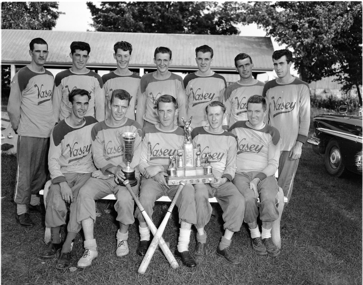 Vasey made a clean sweep of Georgian Bay Rural Softball League honours this year, finishing first in the regular schedule to take the Dr. Garnet E. Tanner Trophy and then winning the playoffs and the J. B. Brown Memorial Trophy. Team members are, left to right, front row, Arley Taylor 2b, Ernie Cowden rf, Stan Robinson ss, Al Lumree cf, Carson Brown p; back row, Earl Widdes 1b. Grant Robinson of, Don Hawke of, Bob Rawson c, Clair Whetham of, Jack Banks 3b, Bob Todd If. (Played the elastic right out of their socks!)