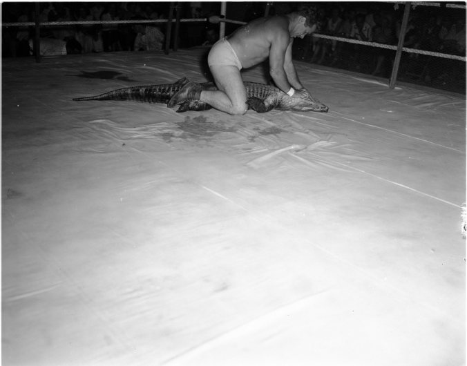 Something new was added to the weekly wrestling at Midland Arena Monday night with the appearance of “Rocky”, the alligator, and “Tuffy” Truesdale, billed as world’s top alligator wrestler. “Tuffy”, who performed the trick himself, invited any of the ladies present to come in the ring and kiss “Rocky’s” nose. There were no takers.