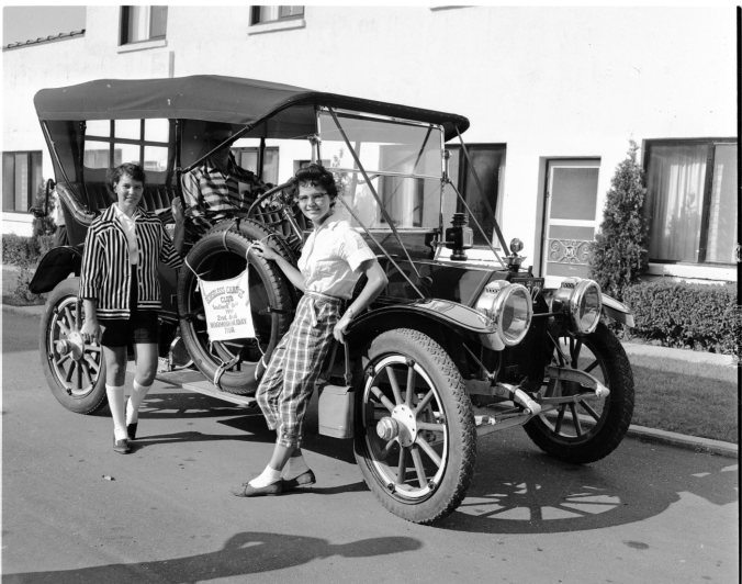Visit of some 40 ancient cars to Midland Monday aroused great interest among local citizens and summer visitors. Beverley and Rhoda Rotenberg, Toronto, pose with a 1912 McLaughlin owned by G. Edington, also of Toronto.