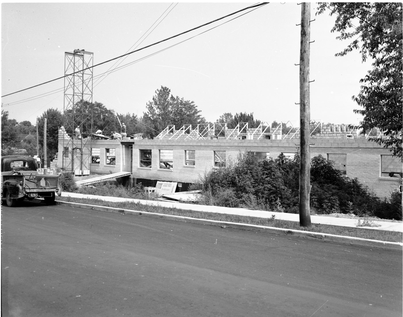 Midland’s new Parkview Terrace apartments are rapidly taking shape on Hugel Ave., at Seventh Street. Miniature elevator (left) has been installed to take building material to the second floor. The new unit will house 12 apartments when completed. (How many of us, girls included, have climbed at least partway up a telephone pole equipped with those steps?)