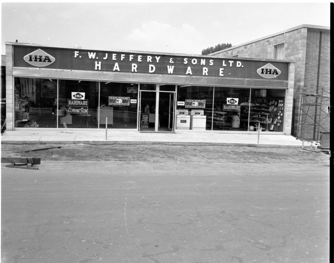 Vacating the King Street site (constructed in 1901) that was their home for nearly 60 years, F. W. Jeffery and Sons Ltd. have opened a new store one block away, on Dominion Avenue west. The store is now a part of the Independent Hardware Association, with some 50 stores operating in Ontario. Utilizing the very latest in design, the store features the self-serve, check-out type of operation that has become so popular in the grocery trade. There will be orchids for the ladies, door prizes and other features as the staff officially opened for business this week. Nap Beauchamp Construction Company was the contractor for the building, which also includes warehouse facilities not seen above.
