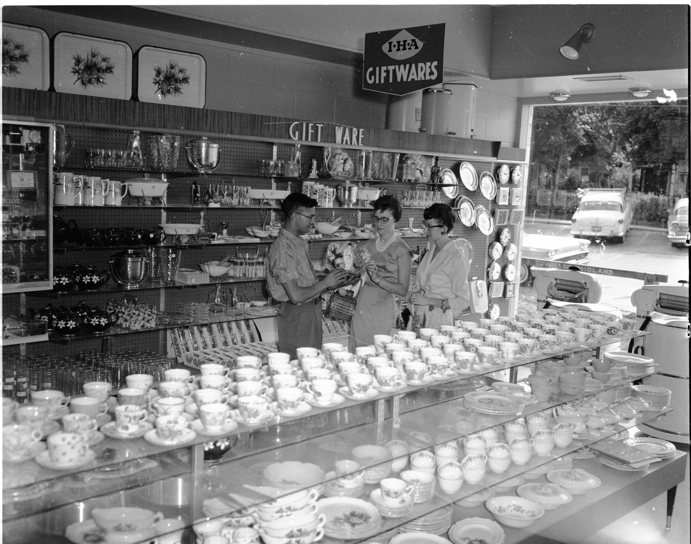 Bob Harrell shows customers fine china at F. W. Jeffery and Sons new store. (Note the angle parking across the road and the houses where the Federal Building is now located.)