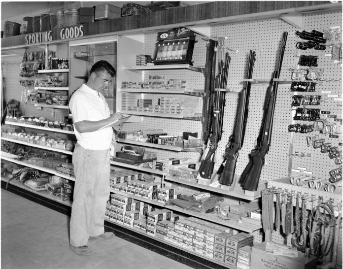 Ed Jeffery examines small arms at F. W. Jeffery and Sons new store. (Ed is a co-owner of the store with his brother William and his mother Mrs. Hazel Jeffery, president.)