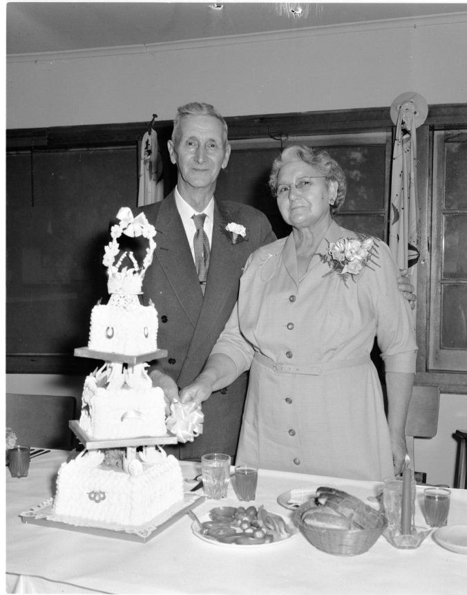 Mr. and Mrs. Joseph P. Cadeau of Victoria Harbour were “beating the gun” just a little bit when they marked their golden wedding anniversary at a reception in Bourgeois dining room Saturday evening. Monday, Sept. 28, was the actual date of the anniversary, but it was more convenient for members of the family to be present Saturday. So, Saturday it was for the well-known Harbour couple. Following their marriage, Sept. 28, 1909, Joseph Cadeau took his young bride, the former Selina Brissette, to the new home he had built for her, just across the CNR overhead bridge at the east end of the village. They have lived there ever since, and it was there they raised their family.