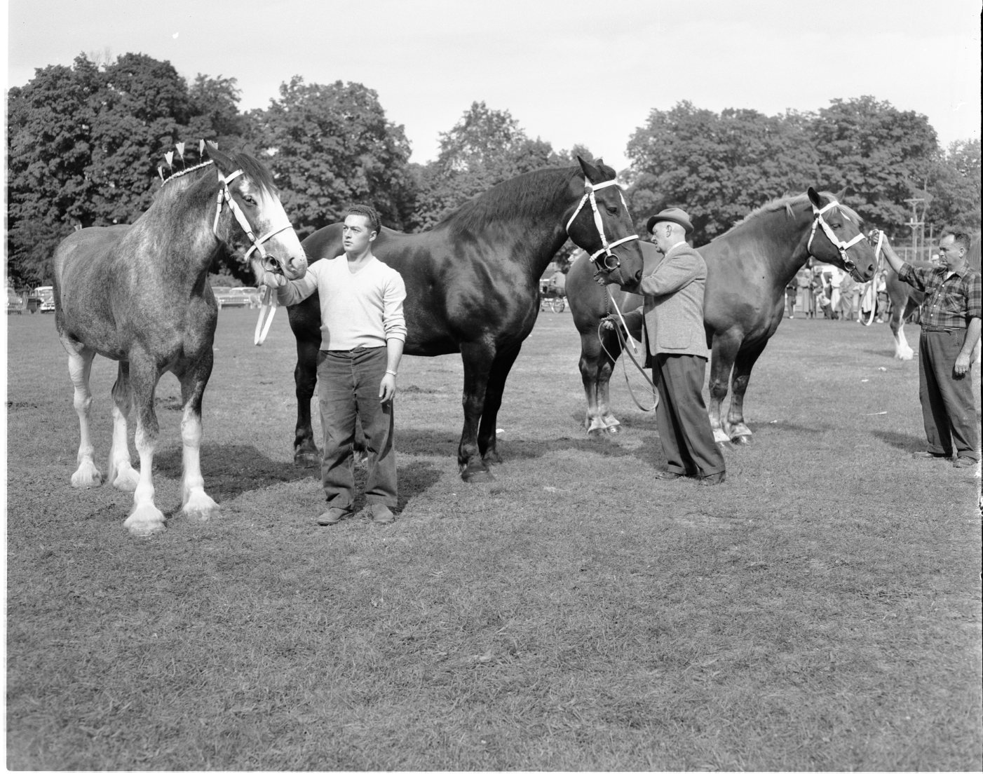 When they call out the best mare or gelding on the grounds, it’s usually a good idea to keep your feet out of the way. These three are lined tip for the judges at Tiny and Tay Fair Saturday and are being shown by Andy Fleming, Elmvale (the winner), Bert Lackey, Jarratt (second) and O. C. Graham, Barrie; (third).