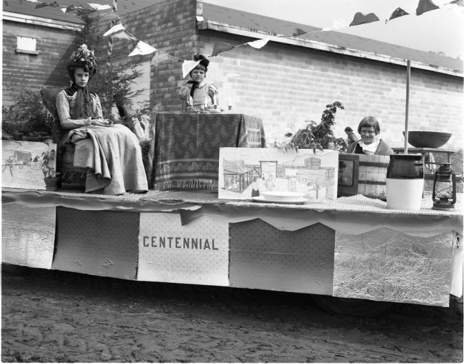 Centennial theme of this year’s Elmvale Fair is expressed in this float entered by Waverley School and manned by Marie Darby, Sandra Druce and Marsha Sibthorpe. Continuing the theme in the lower photo is this wagon and team with an old-time couple Brian Swan and Susan Poole, representing SS 2, Flos.