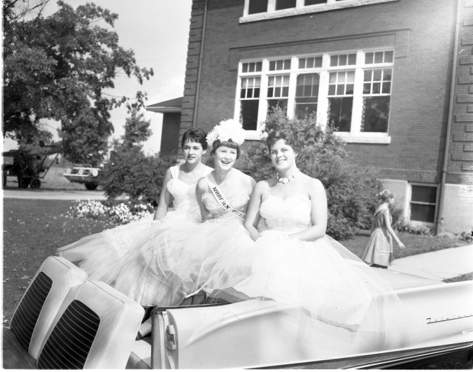 Queen for a day was Peggy Waples of Elmvale, centre, flanked by her princesses Peggy Robertshaw, Waverley, left, and Joy Ingleton of Elmvale R.R., right. Miss Waples queen was named “modern queen” for the Elmvale centennial fair this week.