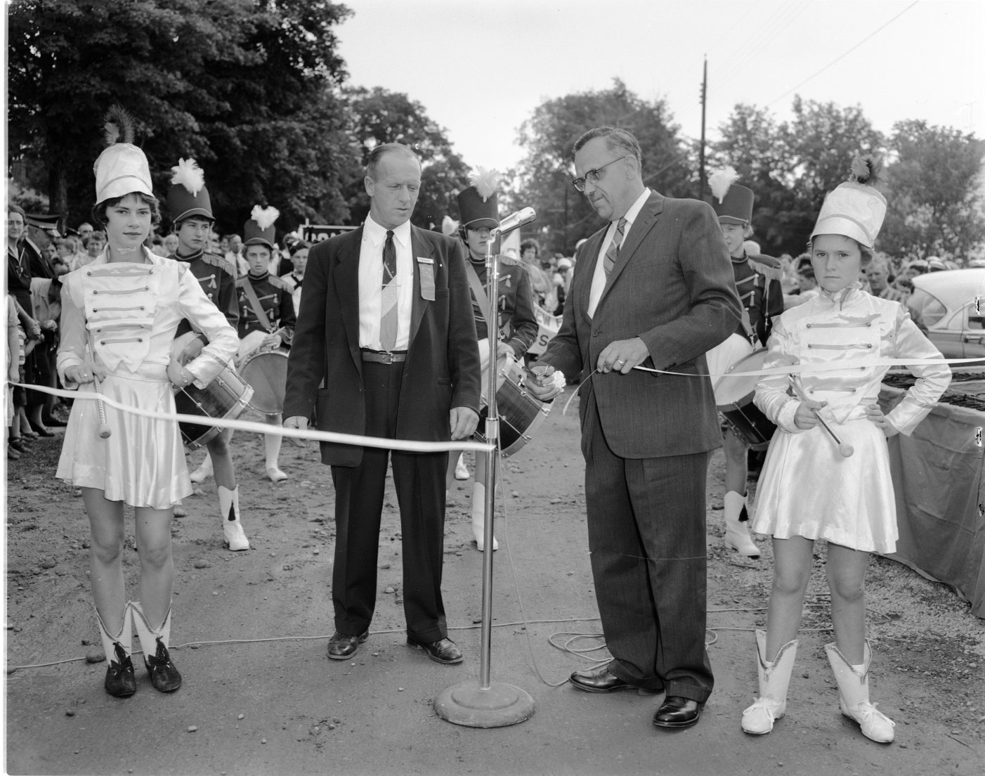 Director of the agricultural society’s branch of the Ontario Department of Agriculture, F. A. Lashley (right), cut the ribbon to officially open the new centennial gates leading into Elmvale fairgrounds. Watching with fair president Reg Bertram are Elmvale majorettes, Joan Kidd, left and Frances Reynolds.
