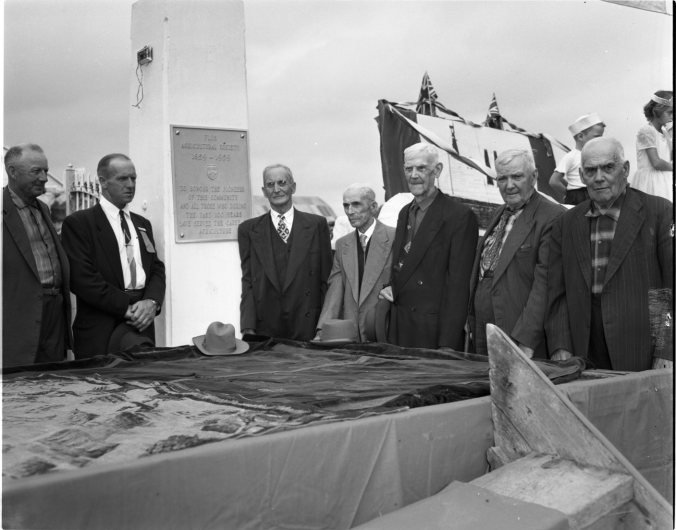 Among the honoured guests at the opening of the centennial edition of Elmvale Fair Tuesday were five pioneers at the right, whose ages total 419 years. Left to right they are Milton Barr, 81, William Archer, 95, John Smith, 88, Fred Richardson, 79, and James Darby, 76. To the left of the memorial plaque honouring the contribution of Flos pioneers to the fair are, former county warden Fisher Ganton and Reg Bertram, fair president.