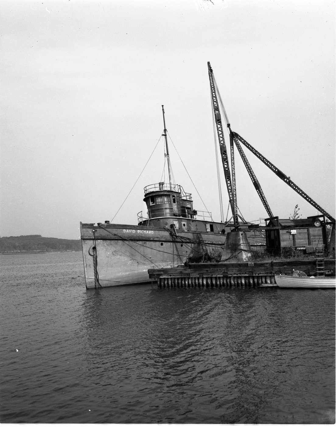 Sunk by vandals who opened her seacocks earlier this month, the tug David Richard has been righted at her berth at Midland Shipyard. For some weeks only the pilothouse and mast of the vessel, owned by Waubaushene Navigation Company, was visible above water.