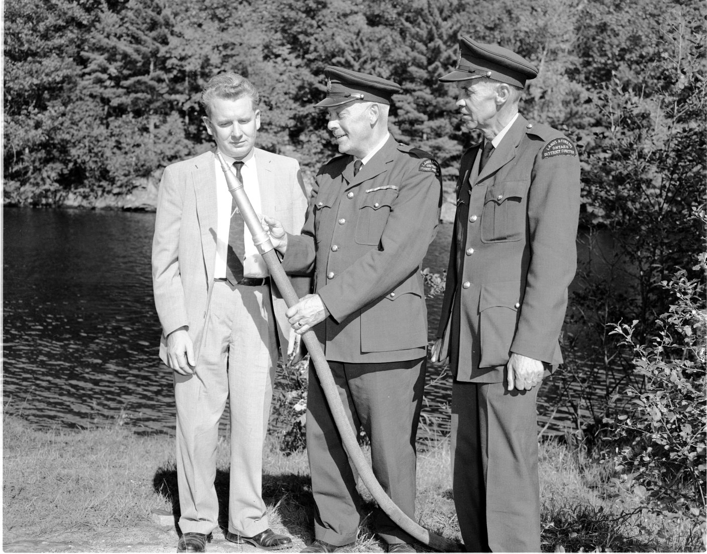 A visit to the Severn River Management Unit at Severn Falls was included in a tour of North Simcoe forests sponsored by the Department of Lands and Forests Friday. Major G. R. Lane of Coldwater shows fire-fighting equipment to former Simcoe Warden, Arthur Evans of Bradford, while Forester Arthur Leman of Maple, (right) watches. Members of council, press, radio and TV made up the party of about forty who made the tour.