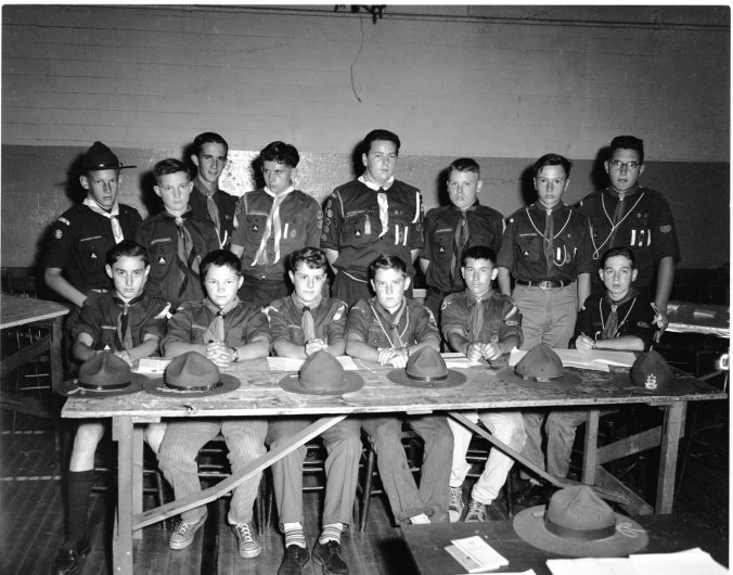 The 1st Huronia Beaver patrol members Clifford Lockhart, Murray Lockhart, Bob Faint, Keith Lockhart, Ken Lockhart and Ron Waples squat Indian fashion in a patrol huddle. (Should have called it the ‘Lockhart’ patrol.)