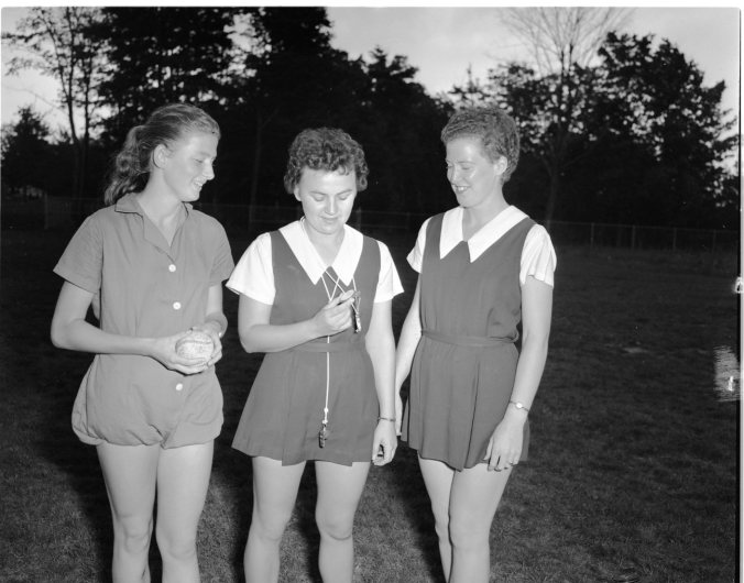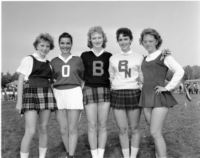 Four pretty girls are fair samples of the inspiration available to the boys of the five schools which participated in the Tudhope field meet at MPDHS Saturday. Representing the cheerleaders of each of the schools are, left to right, Nancy Keith, Collingwood, Liz Lang, Orillia, Gail Pethic, Barrie Central, Bonnie Taylor, Barrie North, and Mary Lou Bissette, MPDHS. (I wonder which one was not considered pretty?)