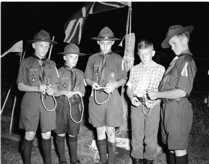 Newest Scout troop in the district, 1st Huronia, has been putting the “out” in Scouting into practice. Bob Turner, Darcy Puddicombe, Gerhard Asmann, Eldon Drinkle and David Jones, members of the Hawk patrol, practice knot tying.