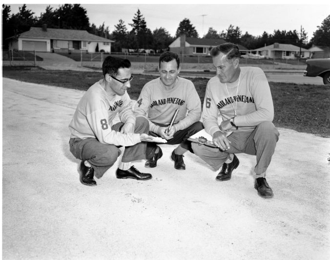 Track coaches Jacques Giroux and Perrie Rintoul, and Athletic Director W. C. Setterington examines the improved track at MPDHS prior to Saturday’s Tudhope-Thompson Cup track and field meet.