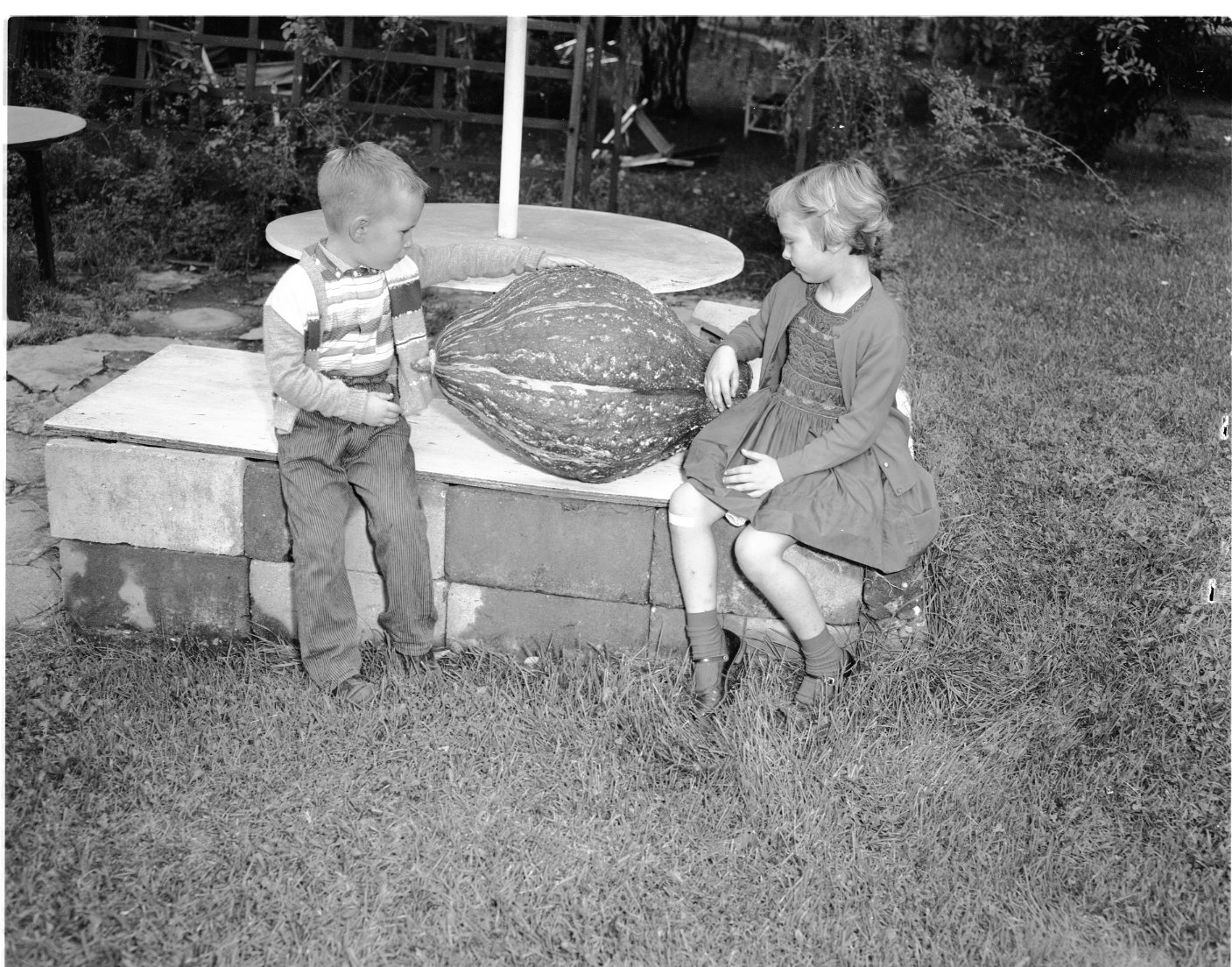 Paul Hudson and Barbara Hudson, children of Mr. and Mrs. Bob Hudson, Midland, put the “squeeze” on a squash grown by Vern Johnson, farmer at R.R. 2, Midland. The Hubbard squash weighs 65 pounds.
