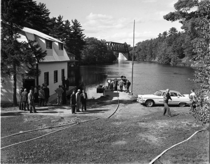 The mighty Severn provides a beautiful setting for the boathouse of the Severn River Management Unit of the Department of Lands and Forests at Severn Falls. Above, rangers are preparing to give a firefighting demonstration for a group of the county council, press, radio and TV members who visited the unit headquarters Friday. Boathouse contains a large cruiser and two fast outboards. The CPR bridge over the Severn River is seen in the background.
