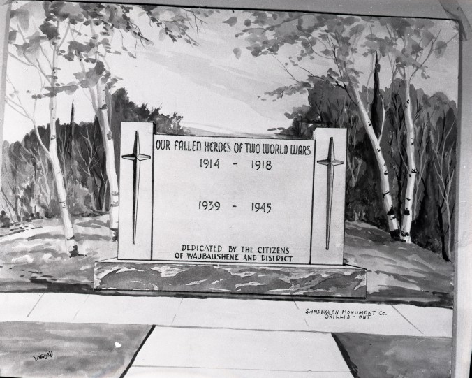 Waubaushene’s new memorial to the dead of two world wars will look something like this when it is completed and erected in the village park, Beaverbrook Branch 316, Canadian Legion, Waubaushene is sponsoring the memorial which will be fashioned from Barre Vt. granite by Sanderson Monument Co., Orillia.