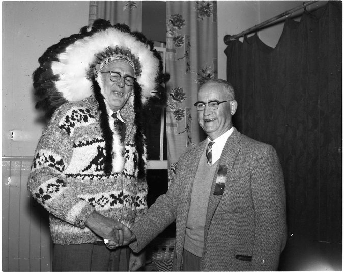 Delight in being made an honorary chief of the Christian Island band of Indians (Beausoleil First Nation) shows on the face of Dr. P. B. Rynard, M.P., as he shakes hands with W. H. Morrison, Penetang, who had stood in as his proxy during the official ceremony held during the annual Achievment Day on the island.