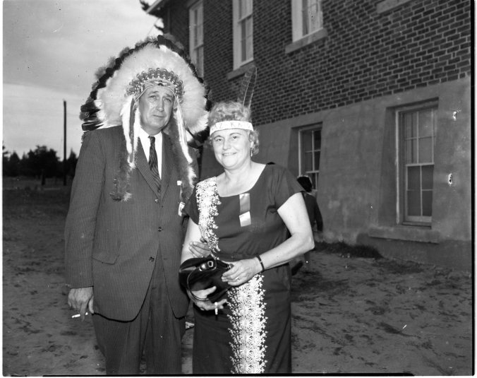 Pair of proud honorary Indians were Mr. and Mrs. Cliff Thomson, following ceremonies at Christian Island, Wednesday. Cliff was made an honorary chieftain with the title “Bird of the Sky.” Mrs. Thomson received her honours last year.
