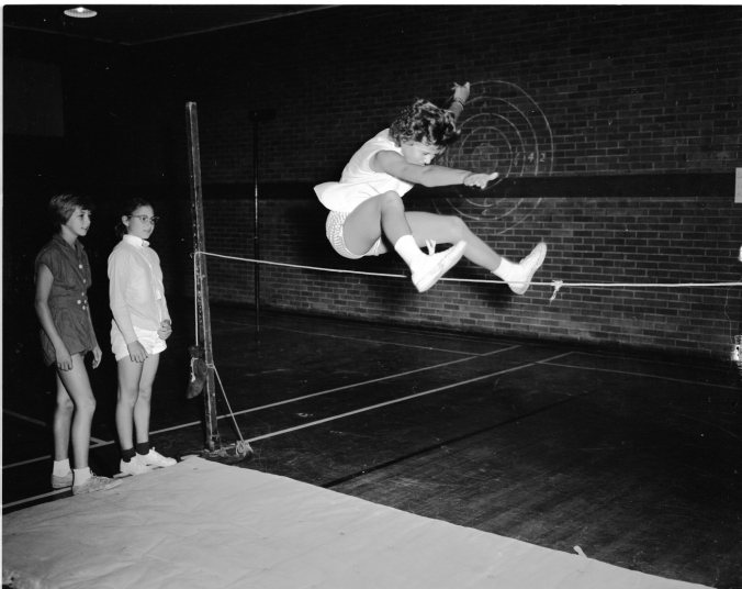 The first member of Midland YMCA to complete the six events of the National YMCA Hi-Lo athletic contest, Nancy Higgs shows considerable promise as a high jumper. Watching Nancy go through her paces at left are Carol Launder and Pam Ellison. To date, 65 boys and 11 girls of the local ‘Y’ have participated in the contest.