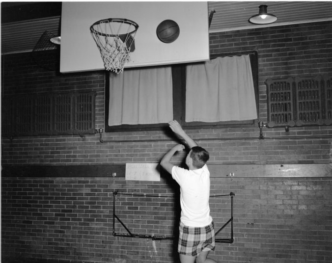 Tossing the basketball through the hoop is one of six events in the National YMCA Hi-Lo athletic contest being carried out at Midland ‘Y’. Paul Downer tries his skill under the basket. Paul and Lynda Duggan have 12 of the points necessary to win a National Hi-Lo crest.