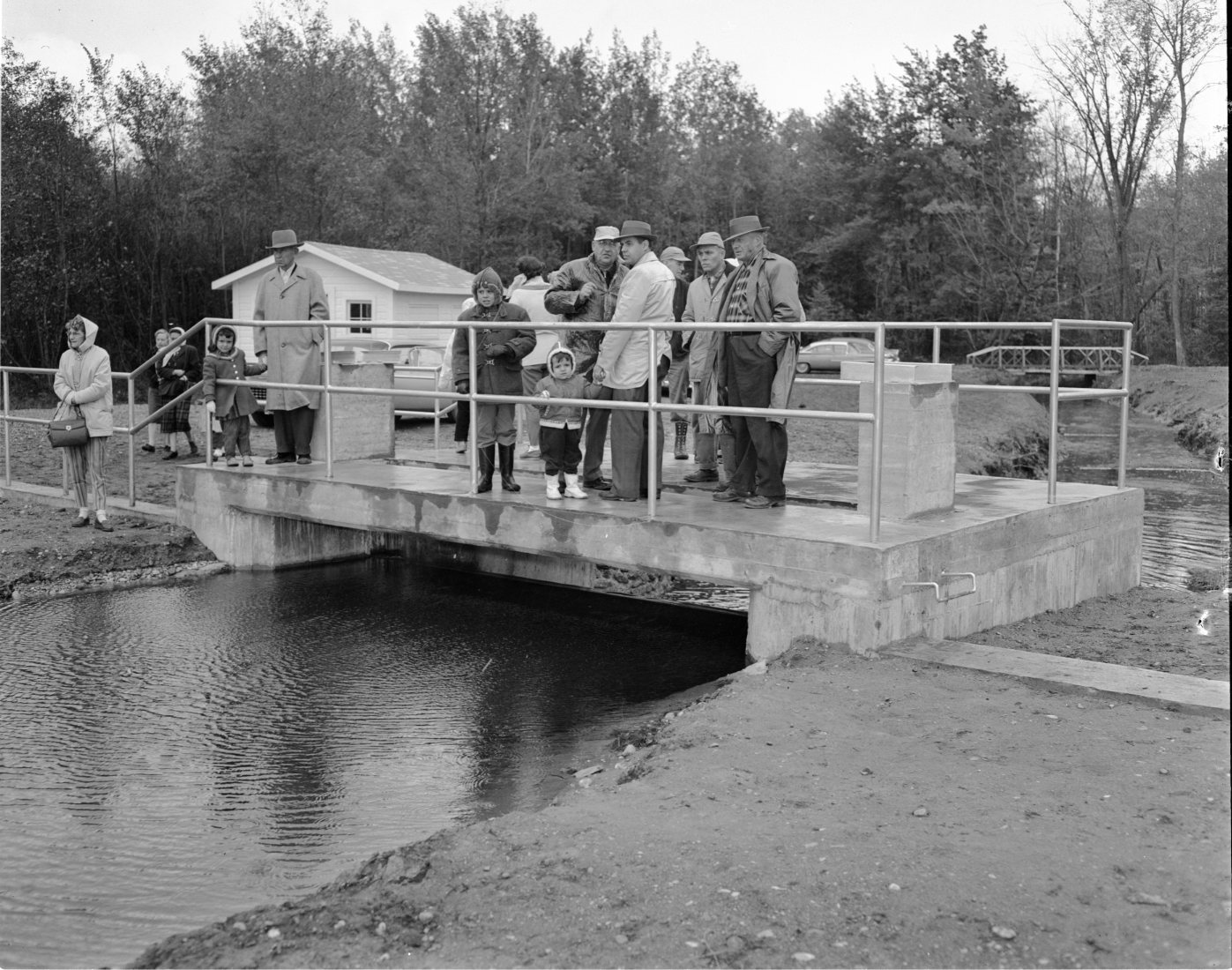 Built by men from the conservation farm camp in Medonte, this new cement dam will control the level of Orr Lake. It replaces a wooden dam weakened by Hurricane Hazel five years ago. Although the official opening of the dam will be Friday afternoon at 4 p.m., a number of officials turned out to inspect the work on a rainy, gusty Thanksgiving holiday afternoon.