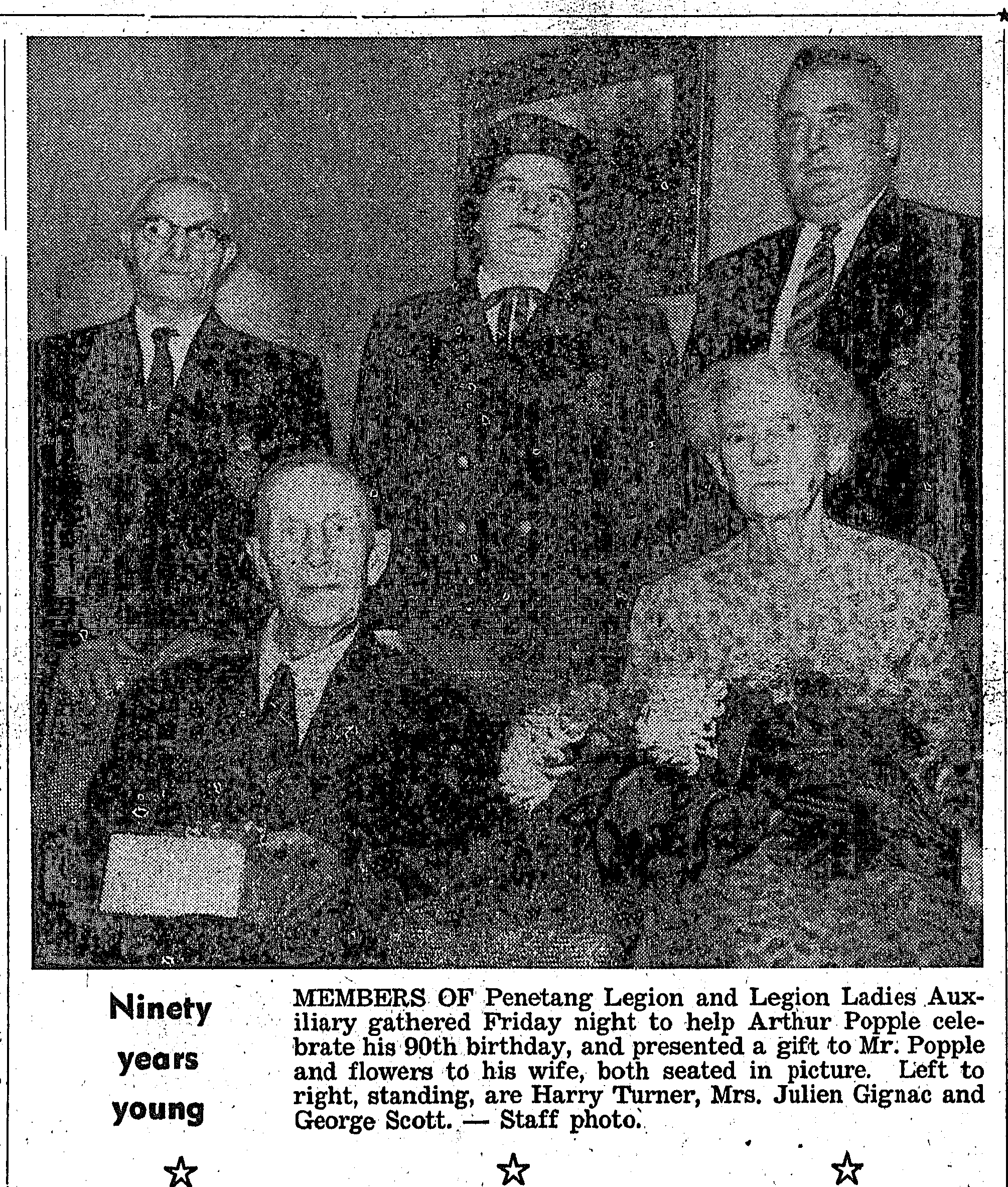 Friday, as he celebrated his 90th birthday, Arthur Popple, Penetang, sat in the living room of his daughter’s home recounting anecdotes of both the Boer War and World War I as though they were events which took place only yesterday. Mr. Popple was talking to members of the Penetang branch of the Canadian Legion and Ladies’ Auxiliary who had come to present a gift to him and flowers to his wife. Arthur Popple was a charter member of Penetang Legion, and is now a life member. Born in England, Mr. Popple was apprenticed to a draper. “That’s the dry goods business to you,” he quipped. He started out to serve his apprenticeship in South Africa, and finding spare time dragging on his hands, he joined the militia. “It wasn’t the same as you do today,” he said. “We really worked at it with drill several nights each week.” About a year later, he was told unceremoniously one morning that he was in the regular army, and was ordered to report immediately for duty in the Boer War. He told of being bottled up for long periods in various locations, with little to do but sit and wait. It was at these times his superior officers would send him to various units to entertain the men by singing. He recalled meeting one man in St. James’ on-the-Lines Cemetery who remembered his singing in South Africa. When he was discharged and finally returned to the store in which he had been employed, he was agreeably surprised to receive an envelope containing pay from his employer for the entire 18 months he had spent in the army. During his stay in South Africa, he made several trips home to England to visit his relatives. He remembers that on one of these occasions he took passage on a freighter which was going to England by way of Australia, New Zealand and the Suez Canal. We didn’t know exactly what ports we would be calling at, for this ship would carry cargo to one port, and receive instructions there to go to another. The Journey ended four months after he had left South Africa. Finally tiring of South Africa, Arthur Popple returned to England where he spent some time before deciding to try his luck in a new country called “Canada.” He and his close friend, Gilbert Milton, arrived in Toronto 48 years ago — “a couple of hicks from England who hadn’t the foggiest notion what they were going to do. “Old Gilbert and I walked out of the Union Station and wondered what we were going to do in this new land. As we wandered along the street, I saw an employment office and asked if there were any jobs. The man said we could have one in Penetanguishene if we got on the train the next day. Because he couldn’t remember the name of the place they were to go, Arthur Popple and Gilbert Milton probably became citizens of Canada in a shorter time than most people. At Union Station the next day, they were trying to buy tickets for “Penang” or some such place, when a stranger took them in tow. This man finally figured out they wanted to go to Penetanguishene, and after assisting them in this way, took them to his office where, after asking a few questions, he declared they were Canadian citizens. On arrival in Penetang, the pair discovered the job was connected with the Breithaupt Tannery, and neither wanted to have anything to do with it. However, they were prevailed upon to stay and worked for some time piling bark in the yard. Eventually, they heard there was a great exhibition taking place in Toronto, so they went to see it. At the conclusion of their visit there, they headed for Western Ontario where they worked for a time. Then Arthur decided to return to Toronto where he obtained temporary employment. However, Penetang must have gotten into his blood, for it wasn’t long before he returned and secured a job in the stove foundry. When World War I came along, Arthur was one of the first to enlist, serving with the Canadian forces throughout that conflict. After discharge, he returned to Penetang where he had left his wife and family. He continued in his job at the stove foundry until his retirement about 20 years ago. Arthur Popple took an early interest in the historical aspects of the Garrison Church, and there are few people in Penetang who can recall more of its history than he. His interest led him to “Lines” cemetery, and on this, he is almost an authority. Following his retirement, he spent a number of years as caretaker of the church and cemetery. He recalls with pleasure the time Viscount Alexander came to visit this area. Rev. R. L. McLaren called me and asked me to meet the Viscount, as he couldn’t be there himself. Lord Alexander was scheduled to spend five minutes there, but I got him so interested he spent more than 25 minutes and would have stayed longer had not some other officials arrived and reminded him of other places he was to visit,” Mr. Popple said. Possibly a part of Mr. Popple’s love of garrison history stems from the fact that he lives in one of the old pensioner’s homes — a log cabin “on the lines,” better known as Church Street. Mr. Popple has been married twice, his first wife having died about 26 years ago. She was an English girl he had met during his stay in Toronto. The couple had five children, four of whom are still, living: Arthur of Weston, Robert and Thomas of Penetang and Nellie (Mrs. Vic Grigg), also of Penetang. Another daughter, Rose (Mrs. Norbert Marchildon), died in Penetang several years ago. There are nine grandchildren and one great-grandchild. Arthur Popple married his present wife, the former Mrs. Jas. Thompson, about 19 years ago, and the couple still maintain their own home. As the Legion group prepared to leave, Mr. Popple reminded them that Nov. 11 would soon be here. “And I’m looking forward to being with you then,” he said.
