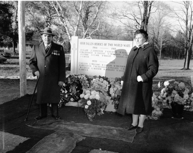 One of the founders of Beaverbrook Branch, Canadian Legion, Waubaushene, Frank Goatcher of Midland and Mrs. Goatcher (In-laws of Pete Pettersen) stand beside the new cenotaph unveiled Sunday afternoon in the village. District Legions and Legion Auxiliaries were represented at the services.