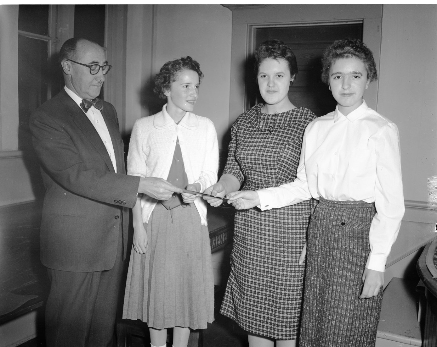 These girls knew most of the answers posed them during their work with Vasey 4-H Calf Club this past year. Receiving cheques from E. Christopherson of Midland are, Carolyn Edwards, Janet Stewart and Madeline Stewart.