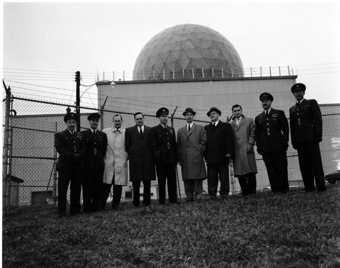 For the first since its opening a few years ago, press, radio and TV representatives in a tour Tuesday were permitted to see how the Pine Tree radar network station, RCAF Edgar, operates. Along with a representative of this paper, the group included left to right: F/L J. H. Maxwell, F/0 P. B. Conroy, James Lamb, Orillia Packet and Times; Pete McGarvey, manager CFOR, Orillia; W/C Hockney, C.O. at Edgar; Bob Hunter, manager CKBB; Bert Snelgrove of CKVR-TV; Milan Korcok, Barrie Examiner; S/L J. A. Cochrane, and S/L W. Honegger. One of the big radar domes, objects of mystery to most North Simcoe residents, is seen in the rear.