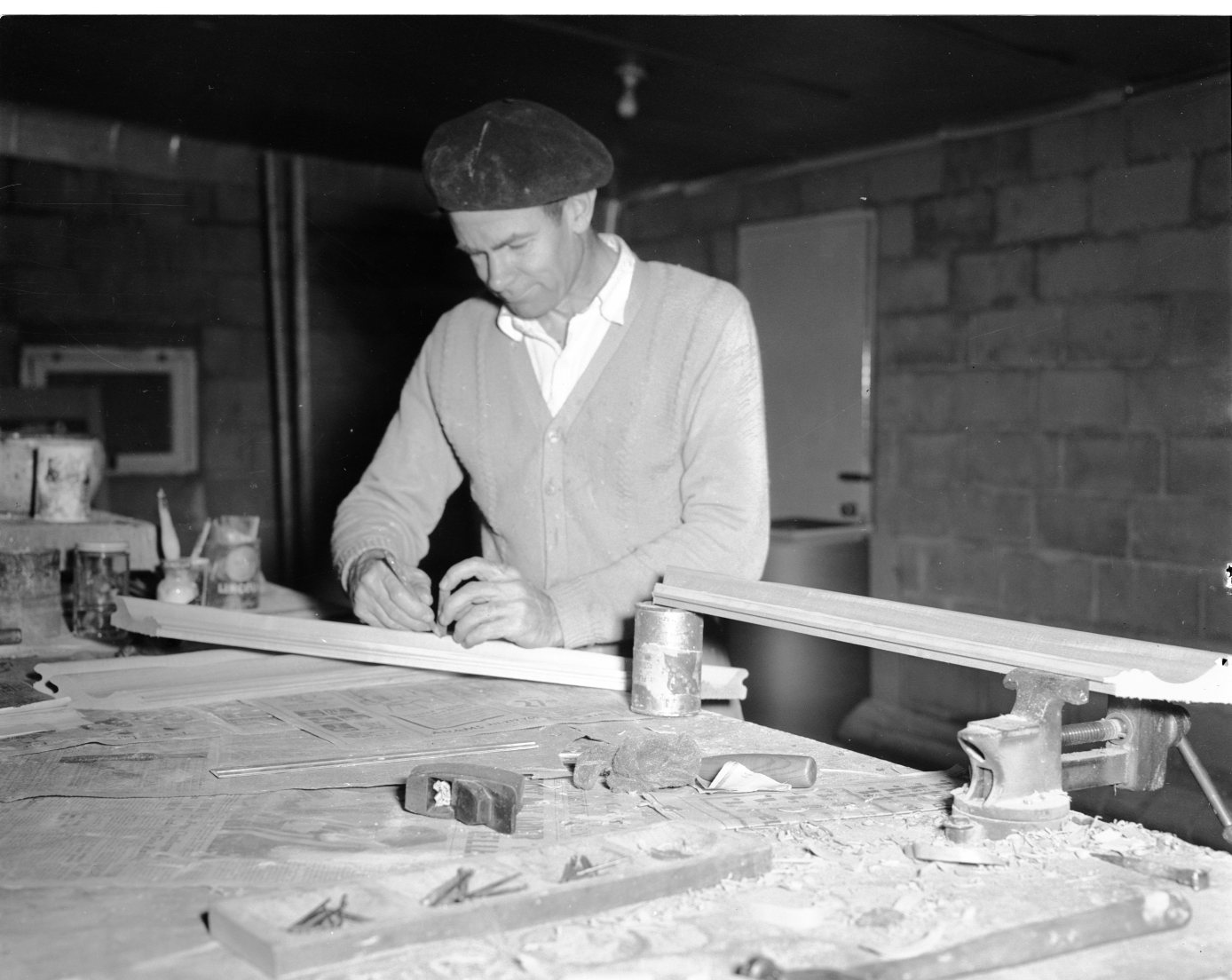Arthur Mitchell fashions a hand-carved picture frame. Author turned carpenter moved to North Simcoe with his wife nine months ago. For quite a few years Mr. Mitchell was a short story writer, with the CBC one of his best customers. But he tired of that profession and now he has literally “carved” out a new career for himself — making picture frames. Mr. Mitchell and his wife came to North Simcoe some nine months ago and bought a neat, white frame house and a partially built shop just off Highway 27, about midway between Waverley and Wyebridge. He put a roof on the building and windows in the gaping holes. Now it keeps him busy to supply enough frames to keep up with the demand.